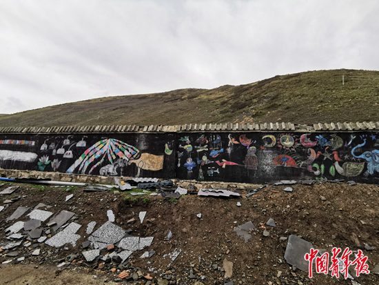 學(xué)校里有一面墻,現(xiàn)代文明的痕跡與傳統(tǒng)游牧的習(xí)俗,被學(xué)生們畫在了一起。畫上有五彩經(jīng)幡、雪山羊群,有絢麗的格?;ê蜏嘏臍址浚约按┲嘏鄞笮Φ暮⒆?。畫上還有直升飛機、火箭和飛碟。