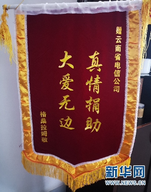 2019年9月,格桑拉姆將書有“真情捐助 大愛無邊”字樣的錦旗,送到前來燕門鄉(xiāng)調研的中國電信云南公司黨委書記、總經(jīng)理王宏手上,以表達自己的感激之情。