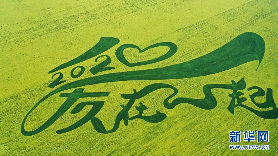 這是7月23日拍攝的青海門源回族自治縣的油菜花田拼出的“2020愛在一起”的圖案(無人機(jī)照片)。新華社記者 吳剛 攝