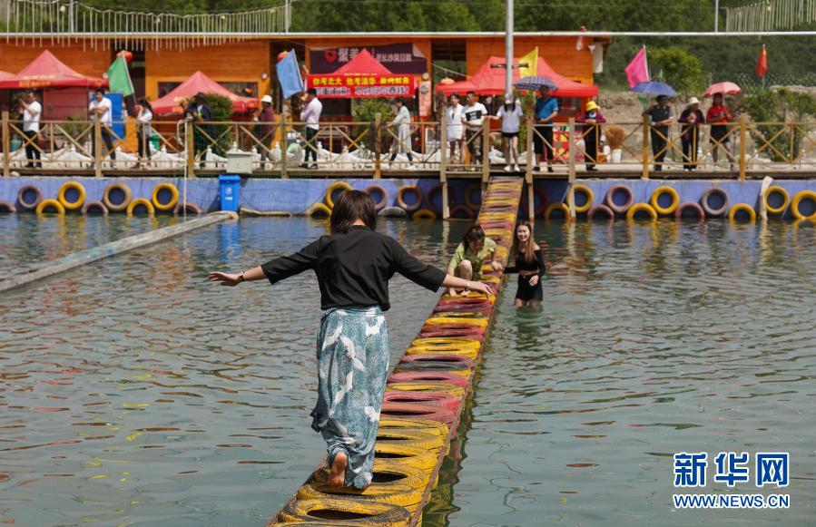 6月9日,游客在青海卓扎灘原生態(tài)景區(qū)的水上吊橋項(xiàng)目玩耍。新華社記者 吳剛 攝