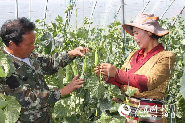 “你們要把瓜葉分叉中長出的小瓜叉去掉,這樣就能減少瓜養(yǎng)分的消耗,長出的西瓜才能又大又甜?!币晃簧綎|漢子在蔬菜大棚里向當?shù)氐霓r(nóng)牧民傳授種植西瓜的心得。2016年10月,理塘縣引進瑪吉阿米農(nóng)業(yè)開發(fā)有限公司,修建58個現(xiàn)代化標準大棚,并從山東引進了溫帶瓜果蔬菜的現(xiàn)代化種植技術(shù)。