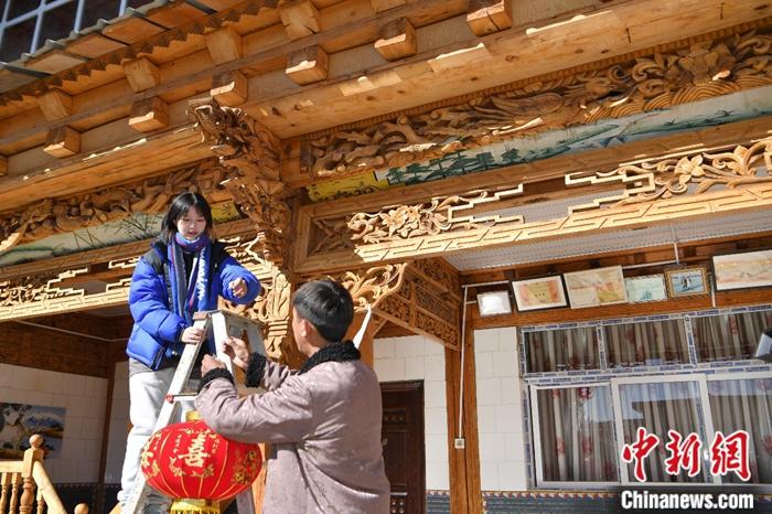 圖為格桑卓瑪在與藏族小伙一起掛燈籠迎接春節(jié)。中新社記者 劉冉陽(yáng) 攝