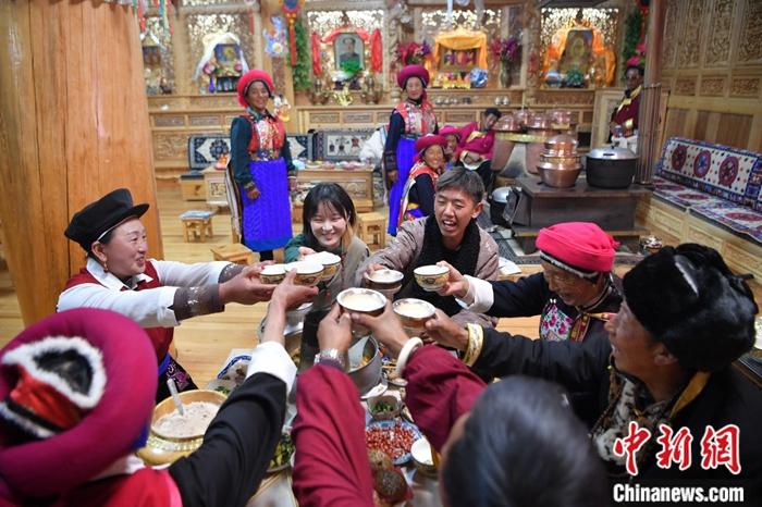 圖為格桑卓瑪與大家一起享豐盛的藏餐。中新社記者 劉冉陽(yáng) 攝