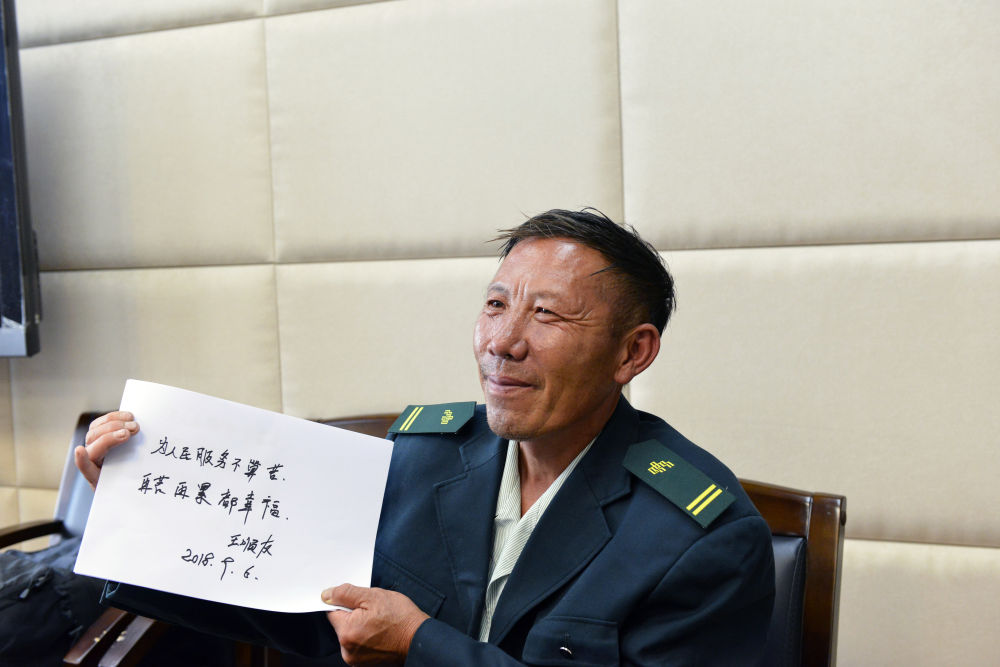 2018年9月6日,王順友寫下“為人民服務(wù)不算苦,再苦再累都幸?!保ㄖ袊]政集團(tuán)有限公司四川省分公司供圖)。