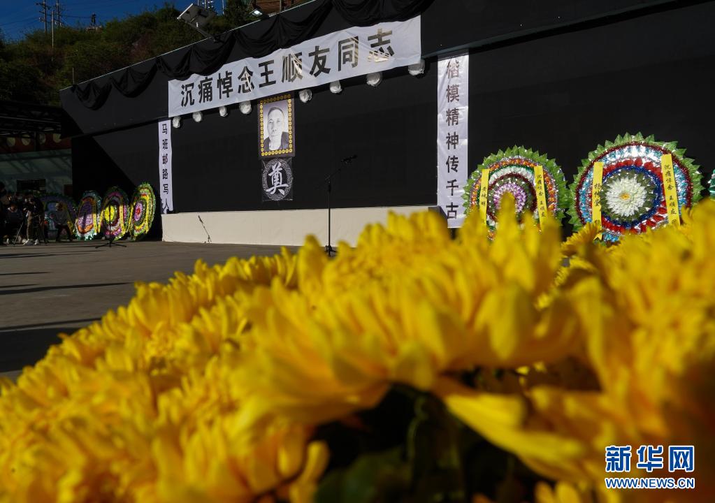 現(xiàn)場莊嚴肅穆、哀樂低回。廣場正中懸掛著遺像和黑底白字橫幅“沉痛悼念王順友同志”,挽聯(lián)寫著:馬班郵路寫人生,楷模精神傳千古。