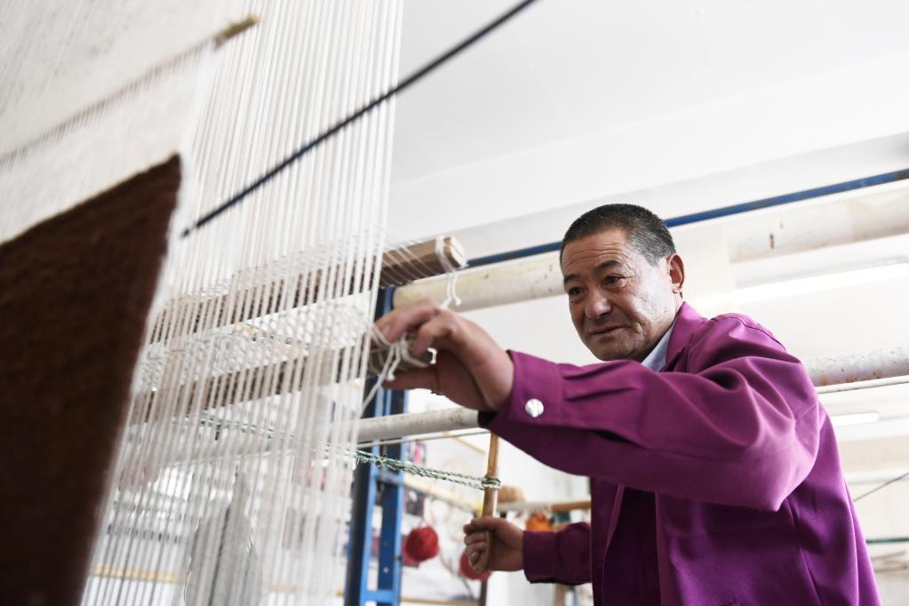 在青海省西寧市湟中區(qū)上新莊鎮(zhèn)加牙村,藏毯手工藝人楊永良坐在一臺(tái)織機(jī)前,五顏六色的毛線穿梭在編織桿間,重疊打扣后,慢慢延展成花色精美的藏毯。