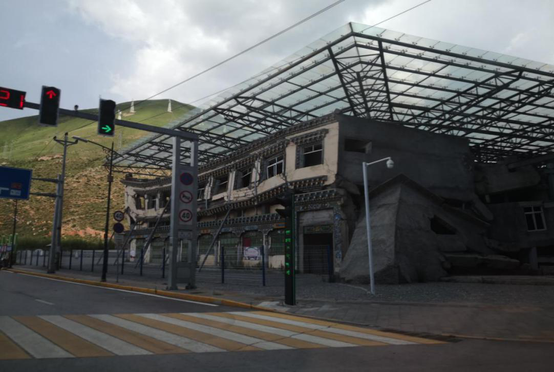 沿著214國(guó)道駛?cè)肭嗪J∮駱渲萦駱涫?,在第一個(gè)路口闖入眼簾的是一座在地震中損毀的房子——這就是3層樓高、擁有71間客房的格薩爾王賓館,它被保留下來(lái)作為對(duì)十年前那場(chǎng)災(zāi)難的紀(jì)念。