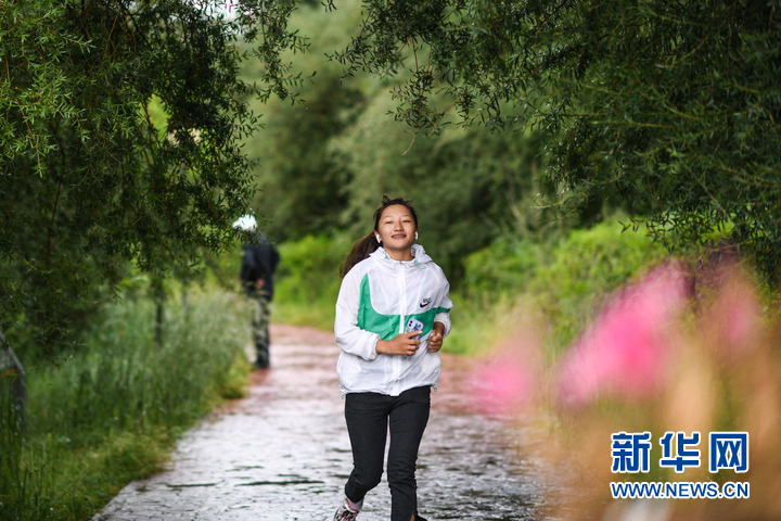 8月7日,市民在玉樹(shù)市巴塘河國(guó)家濕地公園晨跑。新華社記者 吳剛 攝