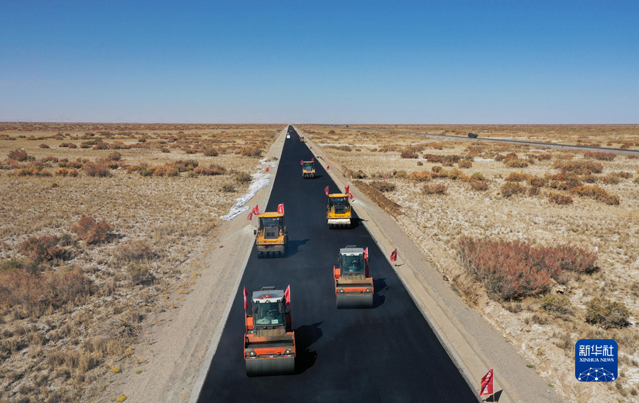 9月29日,在青海省海西蒙古族藏族自治州格爾木市,中鐵五局工作人員在格茫公路擴(kuò)建工程K67公里處施工。新華社記者 嚴(yán)賦憬 攝