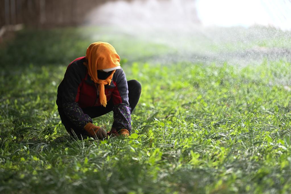 3月23日,藥農(nóng)在青海省海西蒙古族藏族自治州德令哈市柯魯柯鎮(zhèn)的藏紅花大棚內(nèi)除草。新華社記者 王浡 攝