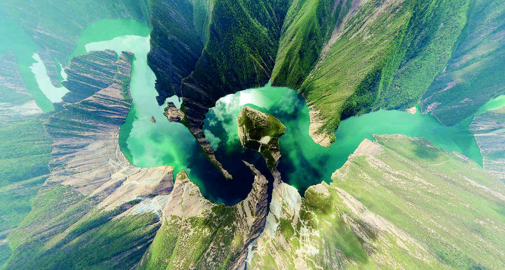 天龍湖是一個向上的世界,這世界被山水抬舉。記者從最佳視角——位于峽谷核心區(qū)普巴絨鄉(xiāng)比貢寺所在的山脊俯瞰,“九曲回腸”的一灣灣碧水在瘦削相對的青山之間,串連似珠玉,蘊翠含黛、峻峭生姿。