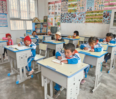 2017年,隨著易地扶貧搬遷政策的落實(shí),越來越多村民選擇搬到山腳開始新的生活。學(xué)校里的孩子們由32名減少到9名。“9個孩子有7個是留守兒童,最大的8歲,最小的3歲。”完么仁增把黑板分成兩塊,左邊是一年級,右邊是學(xué)前班,“安排了語文、數(shù)學(xué)、美術(shù)、道德與法治4門課,采用復(fù)式班的教學(xué)模式”。