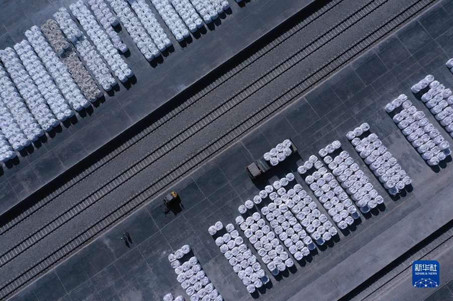 在青海鹽湖工業(yè)股份有限公司鉀肥分公司貨場,車輛在裝運鉀肥(無人機照片)。(資料圖)新華社記者 張龍 攝