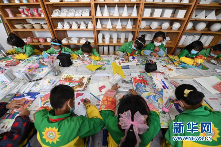 6月15日,在都蘭縣第三小學,葵花繪夢社團在教室中畫畫。新華社記者 范培珅 攝