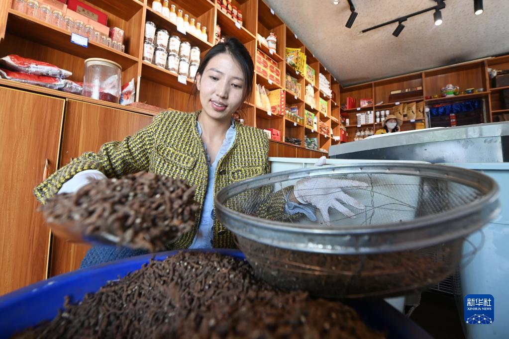 7月12日,在玉樹市察吾拉養(yǎng)殖種植專業(yè)合作社店鋪,代青永措在分裝農特產品。 新華社記者 范培珅 攝
