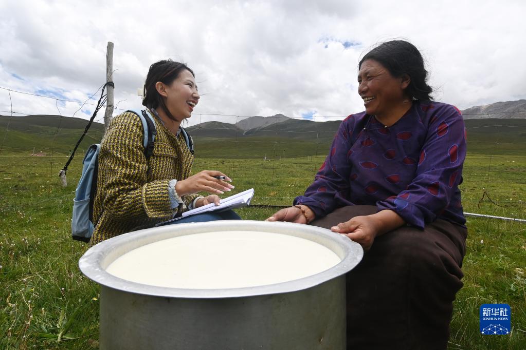 7月12日,在玉樹市巴塘鄉(xiāng)相古村的草場上,代青永措(左)與牧民商量今年農特產品收購事宜。 新華社記者 范培珅 攝