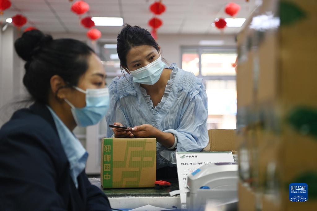 7月12日,在中國郵政儲蓄銀行股份有限公司玉樹藏族自治州結古大道營業(yè)所,代青永措(右)給線上訂單顧客發(fā)快遞。 新華社記者 范培珅 攝