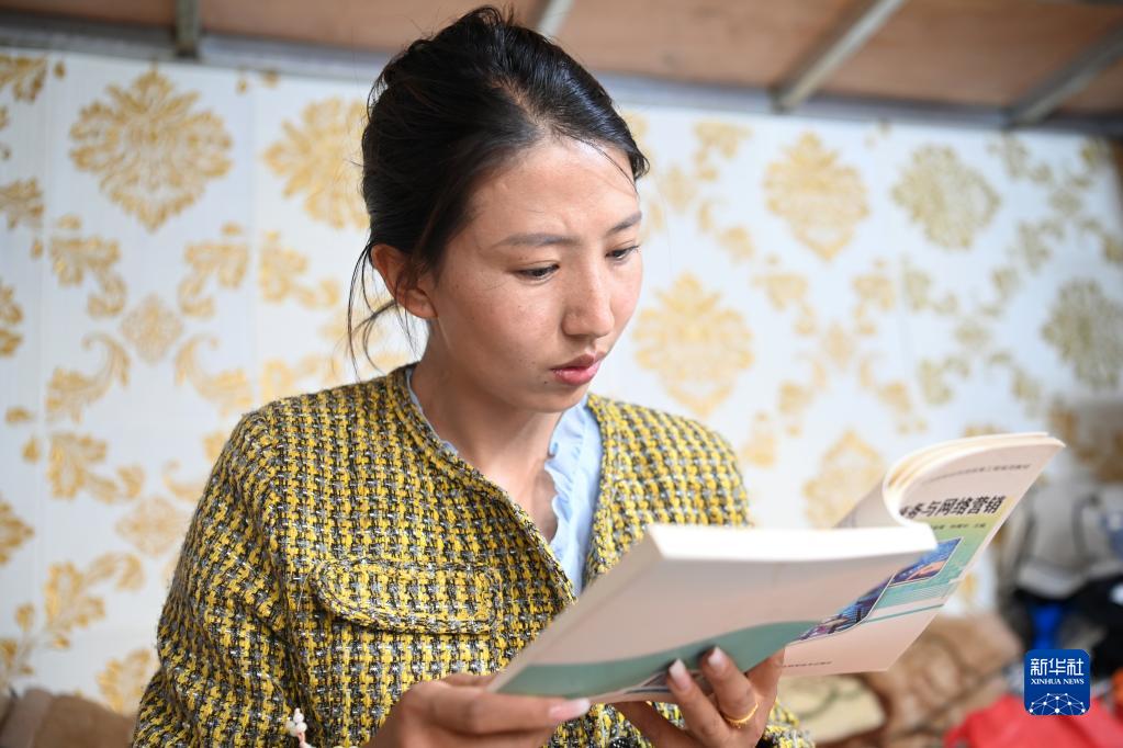 7月12日,在玉樹市察吾拉養(yǎng)殖種植專業(yè)合作社店鋪,代青永措閑暇之余看書學習。 新華社記者 范培珅 攝