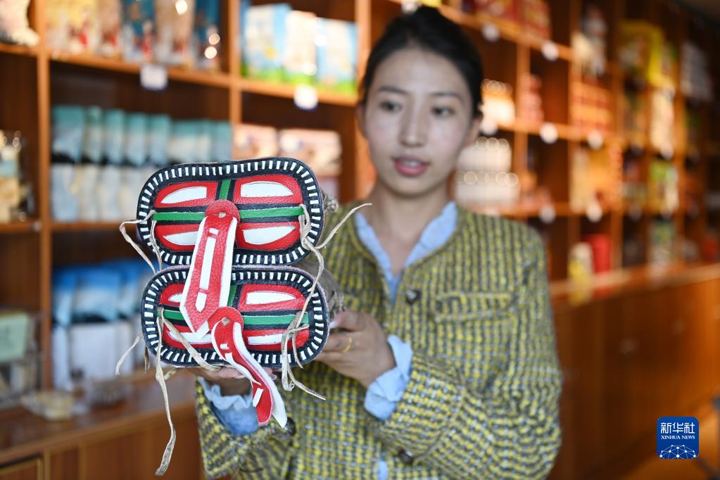 7月10日,在玉樹市察吾拉養(yǎng)殖種植專業(yè)合作社店鋪,代青永措展示無償代銷的牧民制作的手工藝品。 新華社記者 范培珅 攝