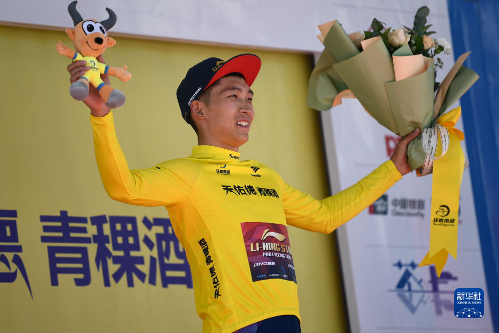 7月27日,李寧之星洲際隊(duì)選手牛益逵在第一賽段后身著黃衫在頒獎(jiǎng)臺(tái)上慶祝。新華社記者 張龍 攝
