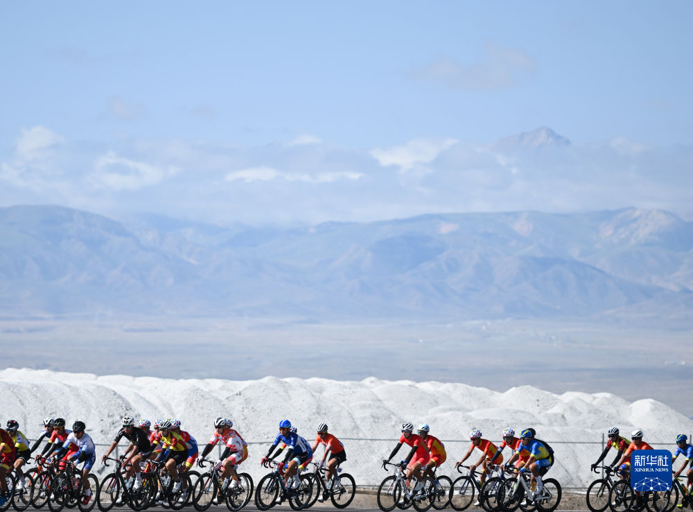 8月1日,參賽選手在第六賽段——茶卡壹號(hào)·鹽湖景區(qū)至都蘭的比賽中騎行。新華社記者 張龍 攝