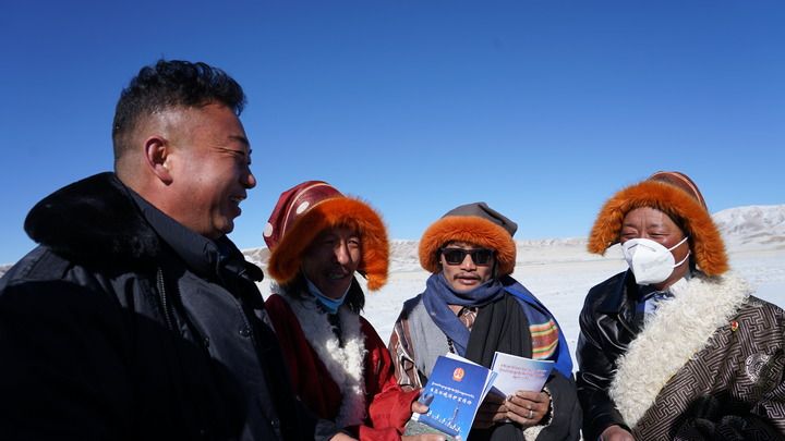 2021年12月20日,瑪多縣人民法院院長錢快乾(左一)給當(dāng)?shù)啬羺^(qū)群眾宣講法律知識。新華社發(fā)
