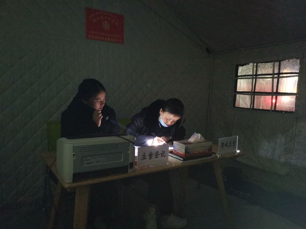 2021年5月26日,在抗震救災(zāi)臨時辦公點(diǎn)的帳篷內(nèi),瑪多縣人民法院法官助理更周措(右)在手電筒照射的燈光下進(jìn)行立案登記。新華社發(fā)