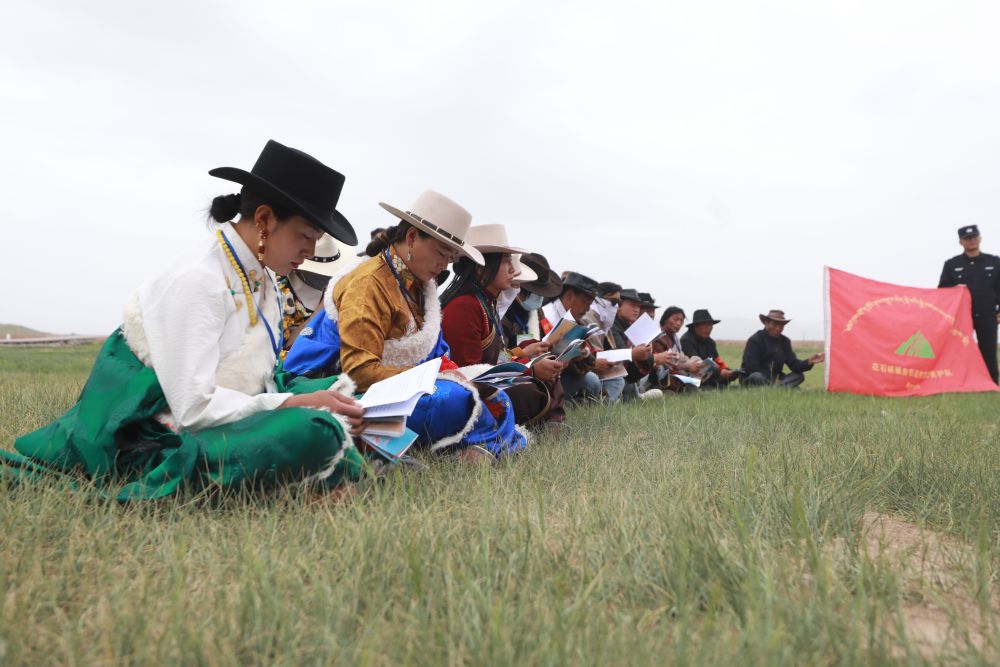 2022年7月12日,在瑪多縣花石峽鎮(zhèn)吉日邁村,瑪多縣人民法院立案庭庭長才偵措(中)在開展環(huán)境保護(hù)相關(guān)法律宣傳。新華社發(fā)