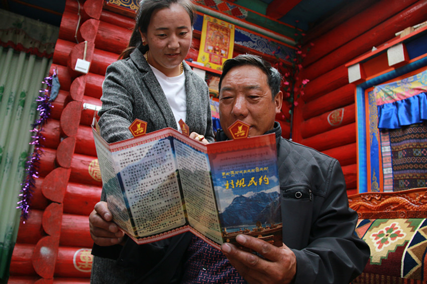 村民正在學習民族團結進步村規(guī)民約。