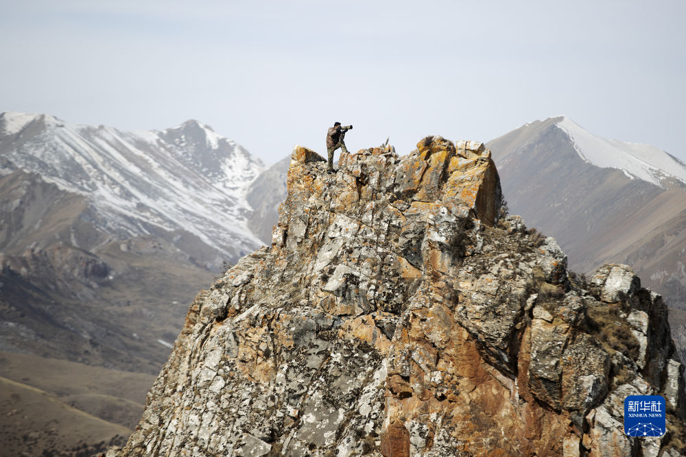 2月22日,更求曲朋在昂賽大峽谷里巡護途中拍照片。新華社記者 費茂華 攝