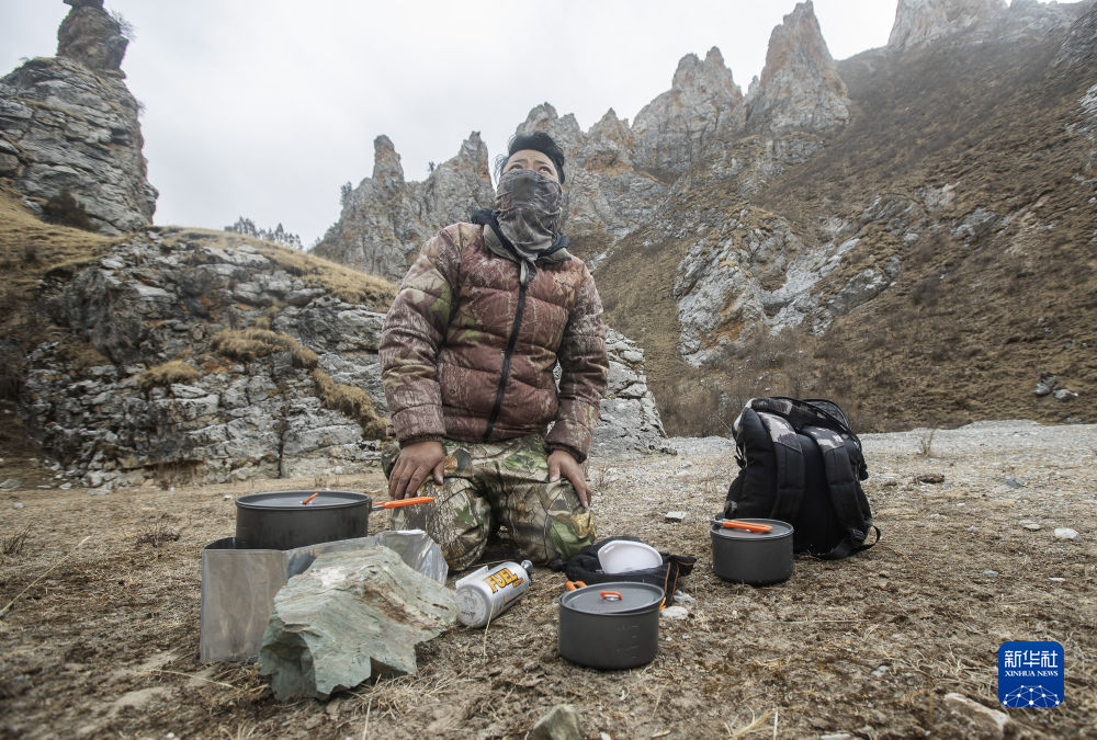 2月21日,更求曲朋在昂賽大峽谷里一邊做飯,一邊查看遠處山上的情況。新華社記者 費茂華 攝