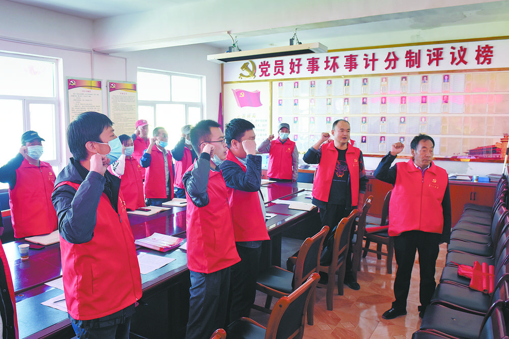 海晏縣金灘鄉(xiāng)東達村黨支部黨員面向黨旗宣誓。