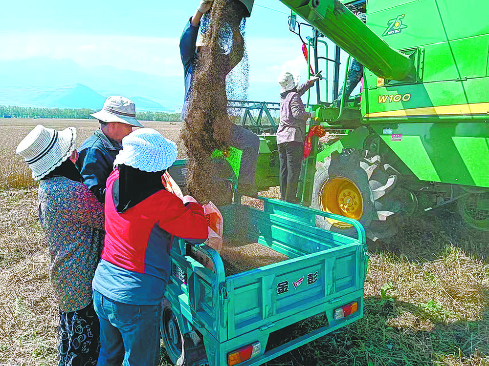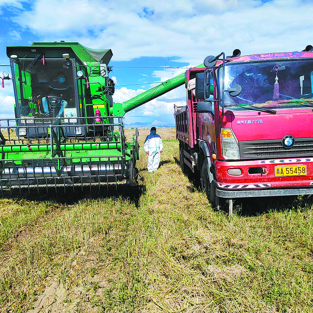 門源縣浩門鎮(zhèn)小沙溝村村民們正使用合作社的收割機收割莊稼。