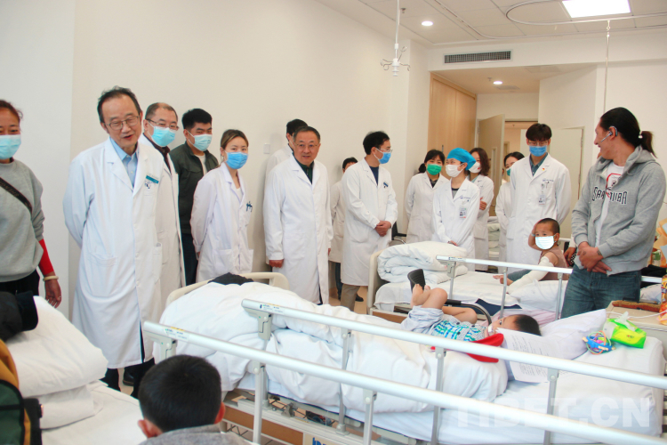 圖為中國(guó)醫(yī)學(xué)科學(xué)院整形外科醫(yī)院院長(zhǎng)蔣海越教授(左六),院黨委書(shū)記王寶璽教授(左二)等院領(lǐng)導(dǎo)班子成員來(lái)到病房看望來(lái)自青海果洛的患兒及患兒家屬攝影:劉莉