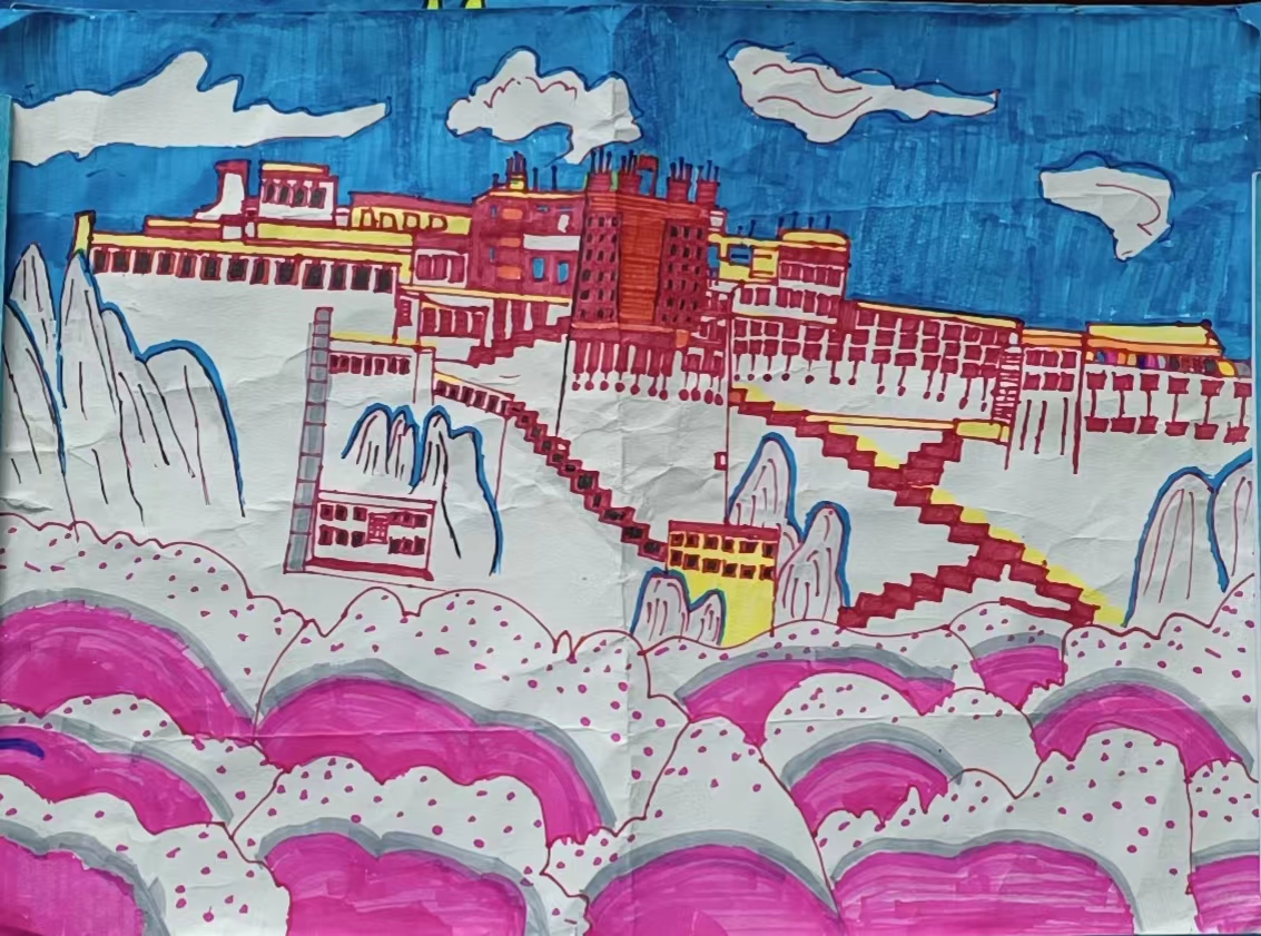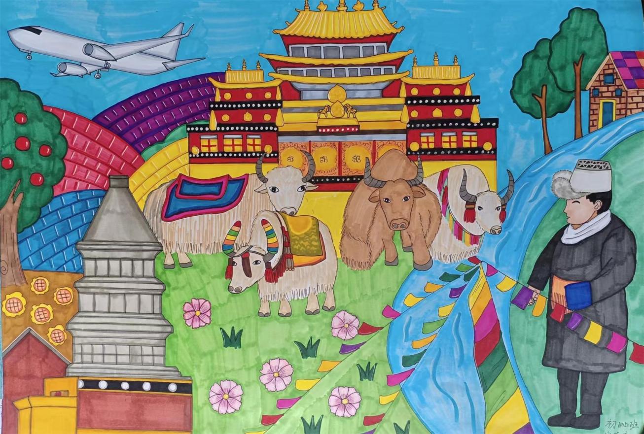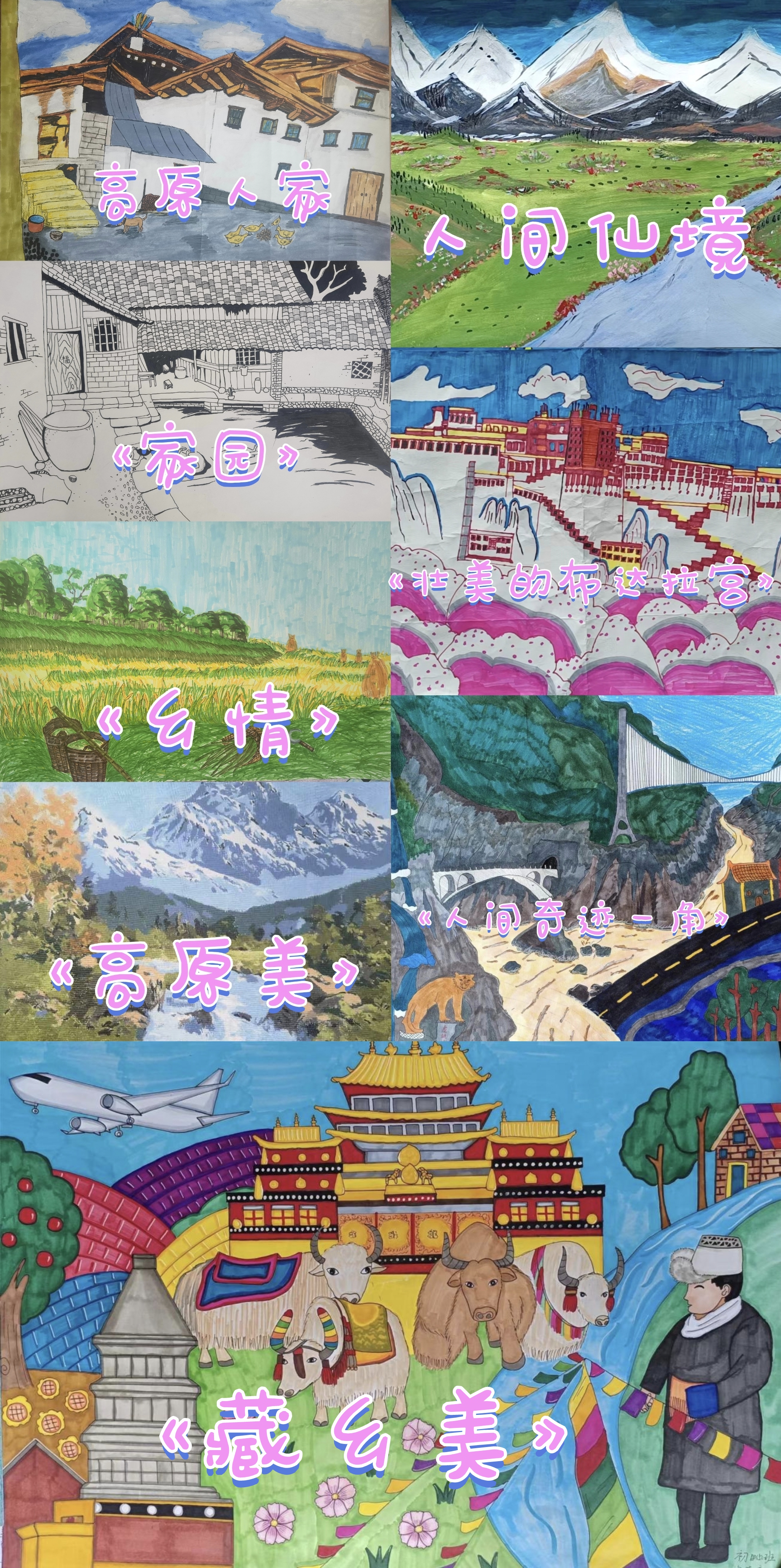其中,初三年級141班拉茸拉姆作品《高原美》榮獲一等獎。初141班邱霞作品《鄉(xiāng)情》、初二年級153班和凱琪作品《人間奇跡一角》榮獲二等獎。初156班格茸培初作品《壯麗的布達拉宮》、初一年級161班金安拉姆作品《美麗的松贊林寺》、初164班貢桑措母作品《松贊林寺》榮獲三等獎。