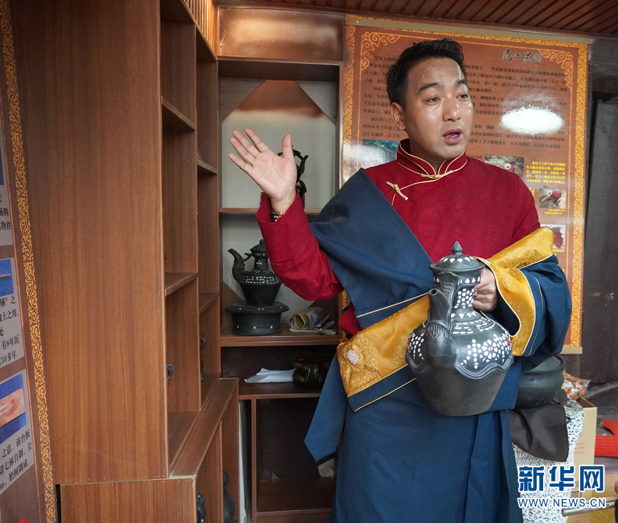 拉茸批初正在介紹尼西黑陶(4月27日攝)。新華網(wǎng) 柴靜 攝