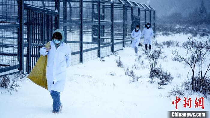 圖為頂風(fēng)冒雪工作的野生動(dòng)物救護(hù)繁育員。包雷 攝