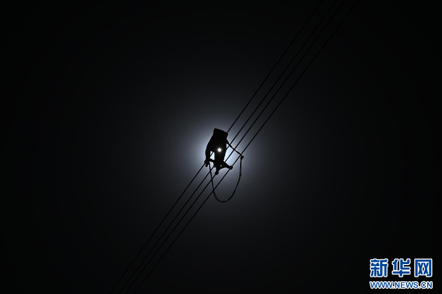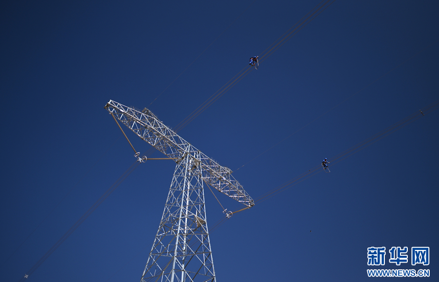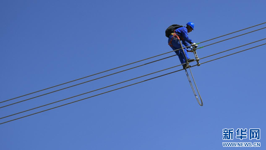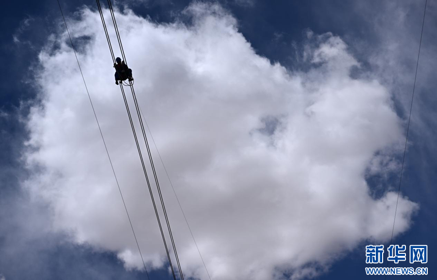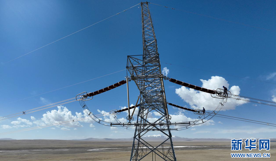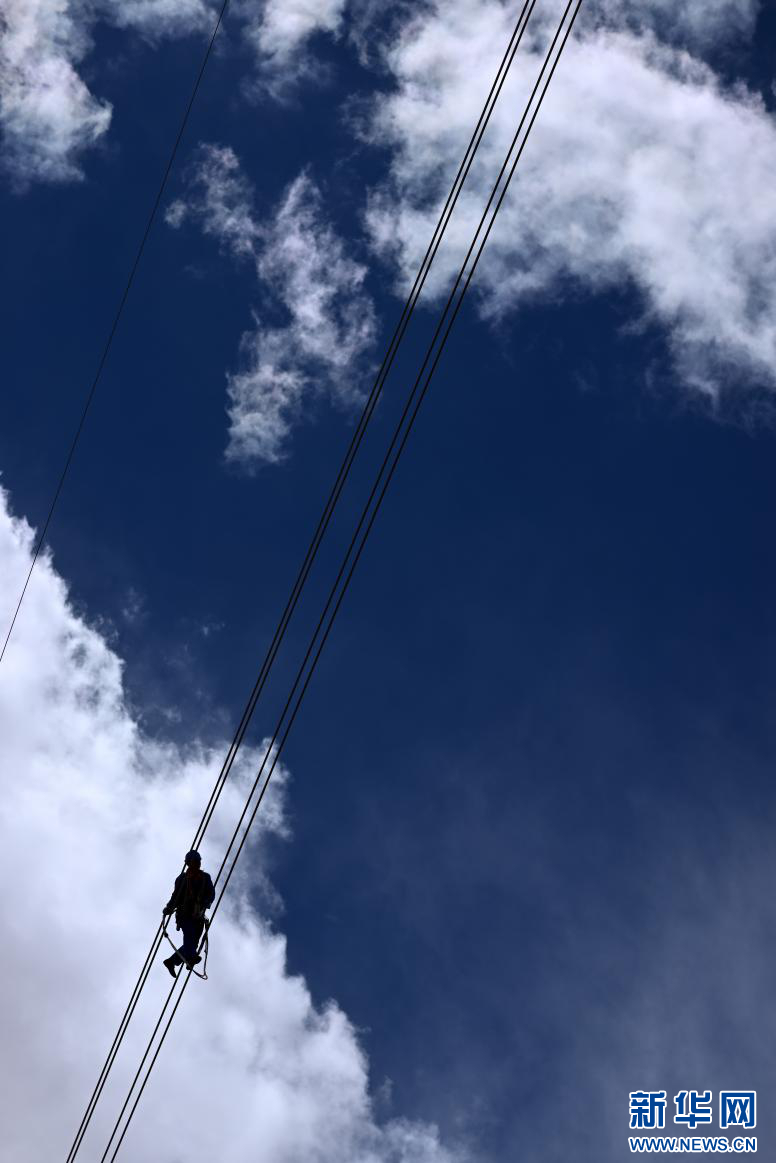 在平均海拔超過4500米的長江源頭腹地,檢修人員克服高寒缺氧的環(huán)境,在云端走線巡檢,成為“電力天路”一道獨特的風景。新華社記者 張宏祥 攝