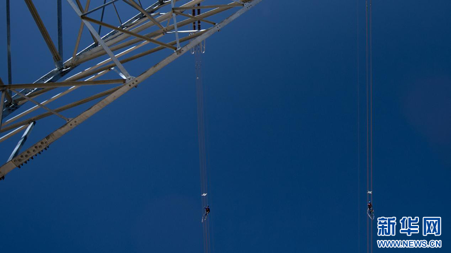 在青海省海西州格爾木市唐古拉山鎮(zhèn)境內(nèi),檢修人員在走線巡檢中(6月3日攝)。新華網(wǎng) 潘彬彬 攝