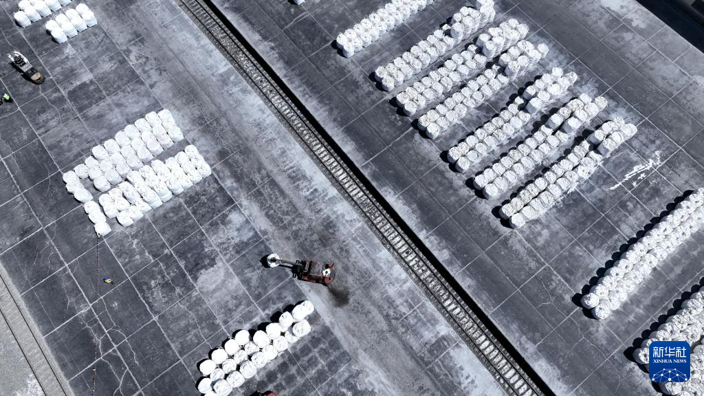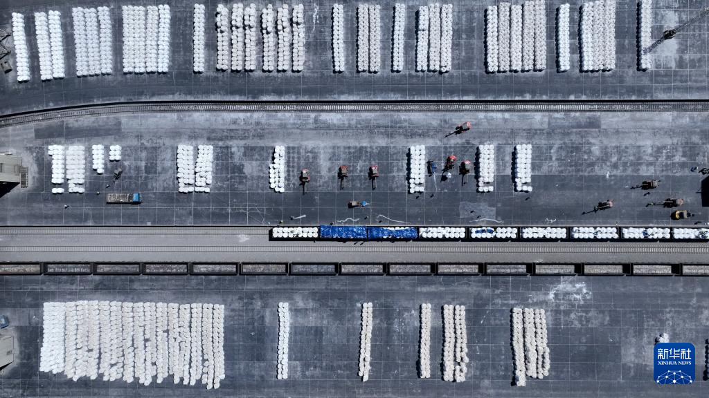 6月12日,在青海鹽湖工業(yè)股份有限公司鉀肥分公司貨場,工作人員在裝運(yùn)鉀肥(無人機(jī)照片)。新華社記者 張宏祥 攝