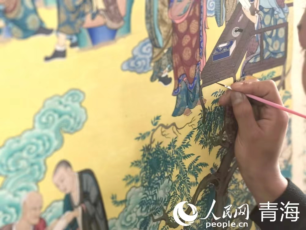 學(xué)徒細(xì)致描繪唐卡。人民網(wǎng) 馬可欣 攝