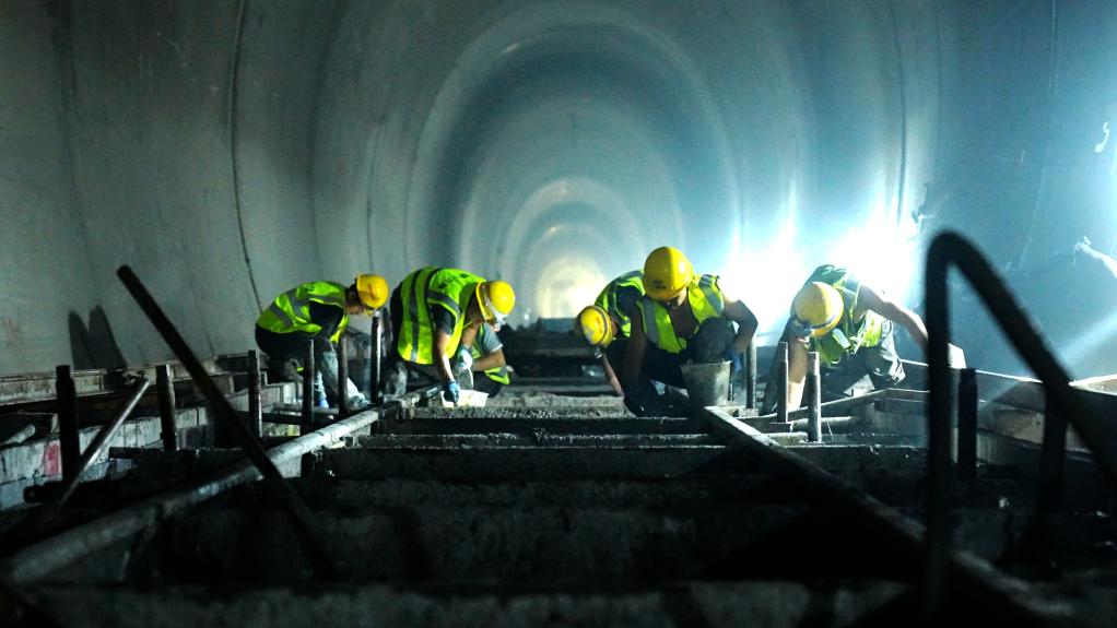 7月8日,滇藏鐵路麗香段哈巴雪山隧道內(nèi),建設(shè)者進(jìn)行無(wú)砟道床施工。新華社記者 丁怡全 攝