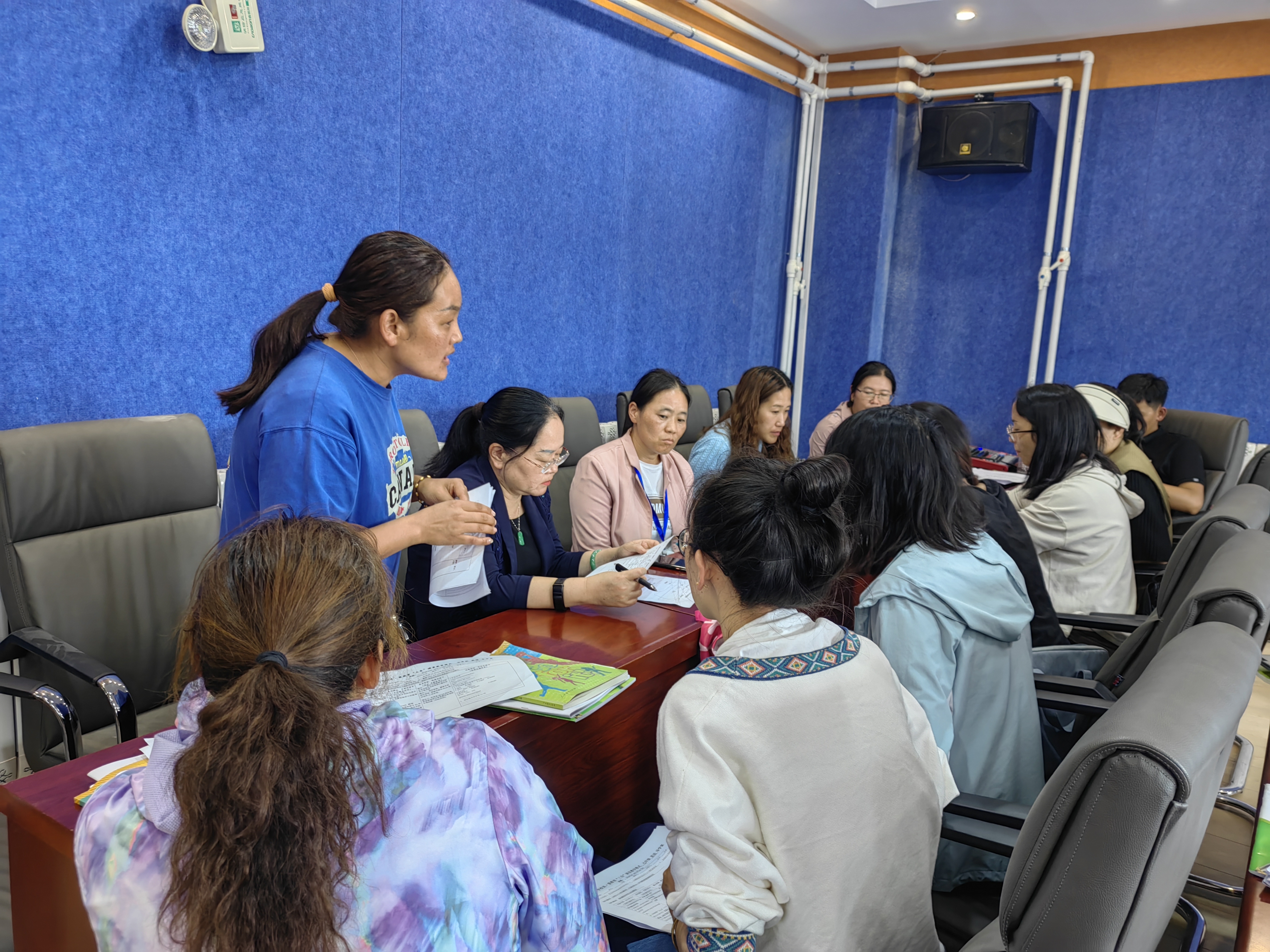 陳兆鴻(右三)正與三個年級的英語老師研討(張燕 攝)