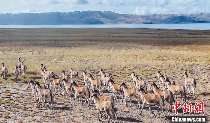 圖為無(wú)人機(jī)航拍成群藏野驢在湖邊漫步。 瑪多縣委宣傳部 供圖
