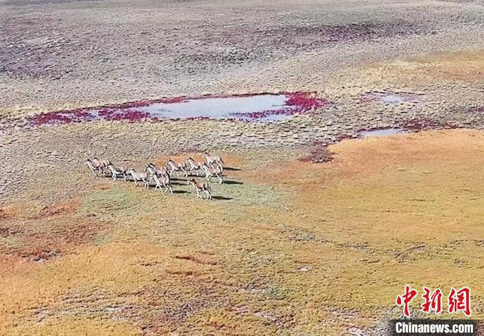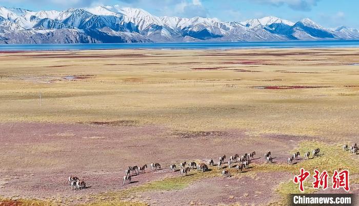 圖為無(wú)人機(jī)航拍成群藏野驢在湖邊覓食。 瑪多縣委宣傳部 供圖
