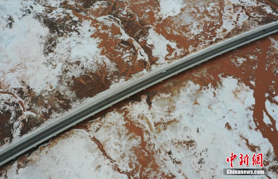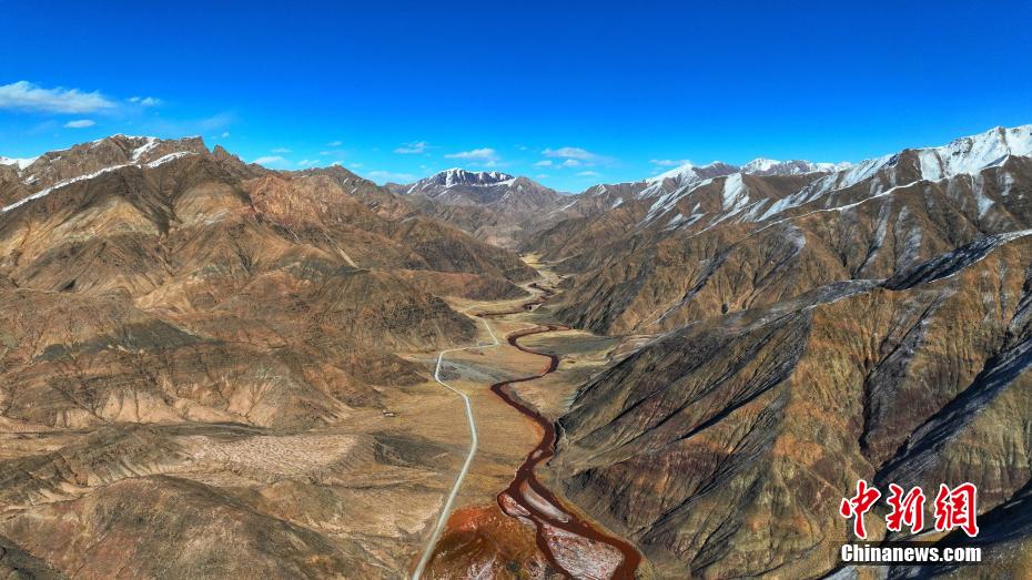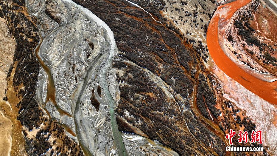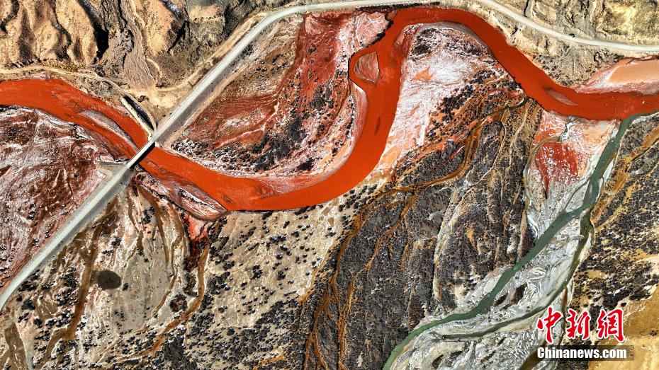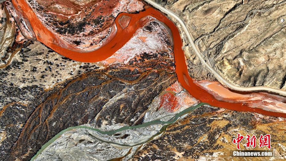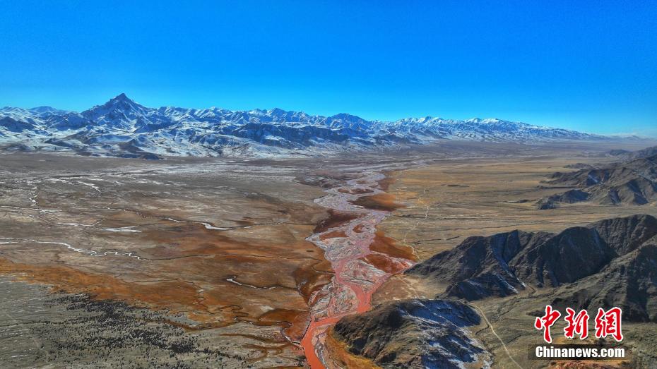 11月寒冬,攝影愛好者在地處柴達(dá)木盆地的青海省海西蒙古族藏族自治州都蘭縣香日德香加鄉(xiāng),航拍香日德河。鏡頭之下,香日德河河床寬大,水量充沛,因夾帶大量紅色泥沙,使得河水變成了混濁的紅色,當(dāng)?shù)厝罕娙∶小盀跆m烏蘇”,意為紅色的河水。從空中俯瞰,整個(gè)水系似“大地血脈”。