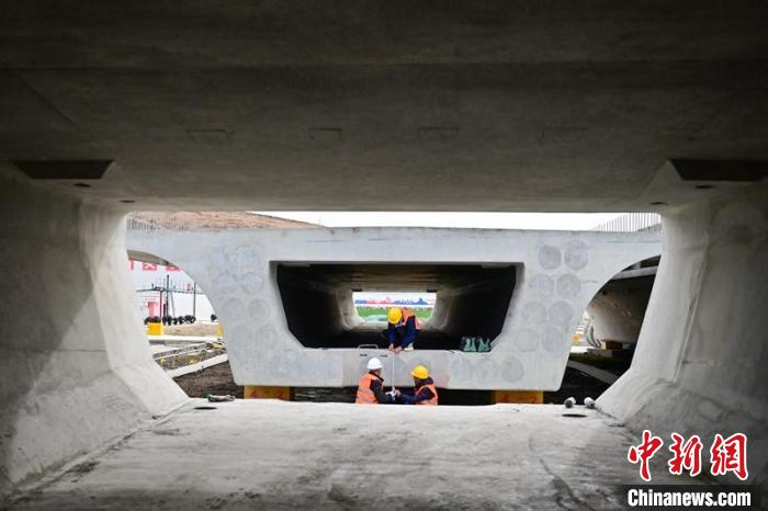 工程技術(shù)人員檢查首批已完成預(yù)制的箱梁。記者 劉忠俊 攝