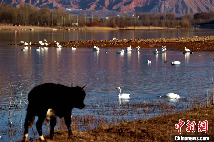 12月8日,記者前往青海省黃南藏族自治州尖扎縣,在母親河黃河河畔看到成群結隊的野生大天鵝在此棲息越冬,或暢游湖面,或振翅高吟。野生大天鵝群的到來,為冬天的黃河上游增添靈氣,勝似一群潔白的精靈“躍”動在冬日的高原大地。