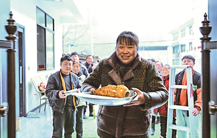 1月10日早上8點(diǎn),冷磧鎮(zhèn)杵坭村劉有蓉一家舉行了簡(jiǎn)單的進(jìn)門儀式,隨著一聲“吉時(shí)已到,開(kāi)財(cái)門!”親朋好友手上拿著米油、柴、甘蔗、梯子、盆栽等寓意美好的物品,嘴上說(shuō)著吉祥話,依次進(jìn)門,為新家增添喜氣。