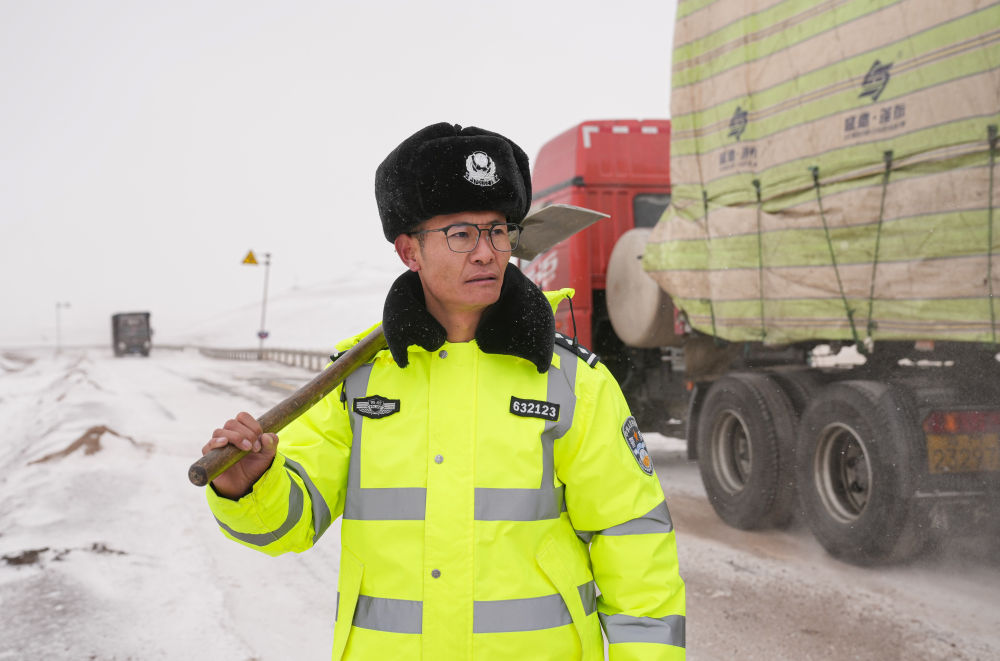 安多交警大隊(duì)秩序中隊(duì)隊(duì)長達(dá)娃云旦在冰雪路段緊盯過往車輛(2024年2月1日攝)。新華社記者 晉美多吉 攝